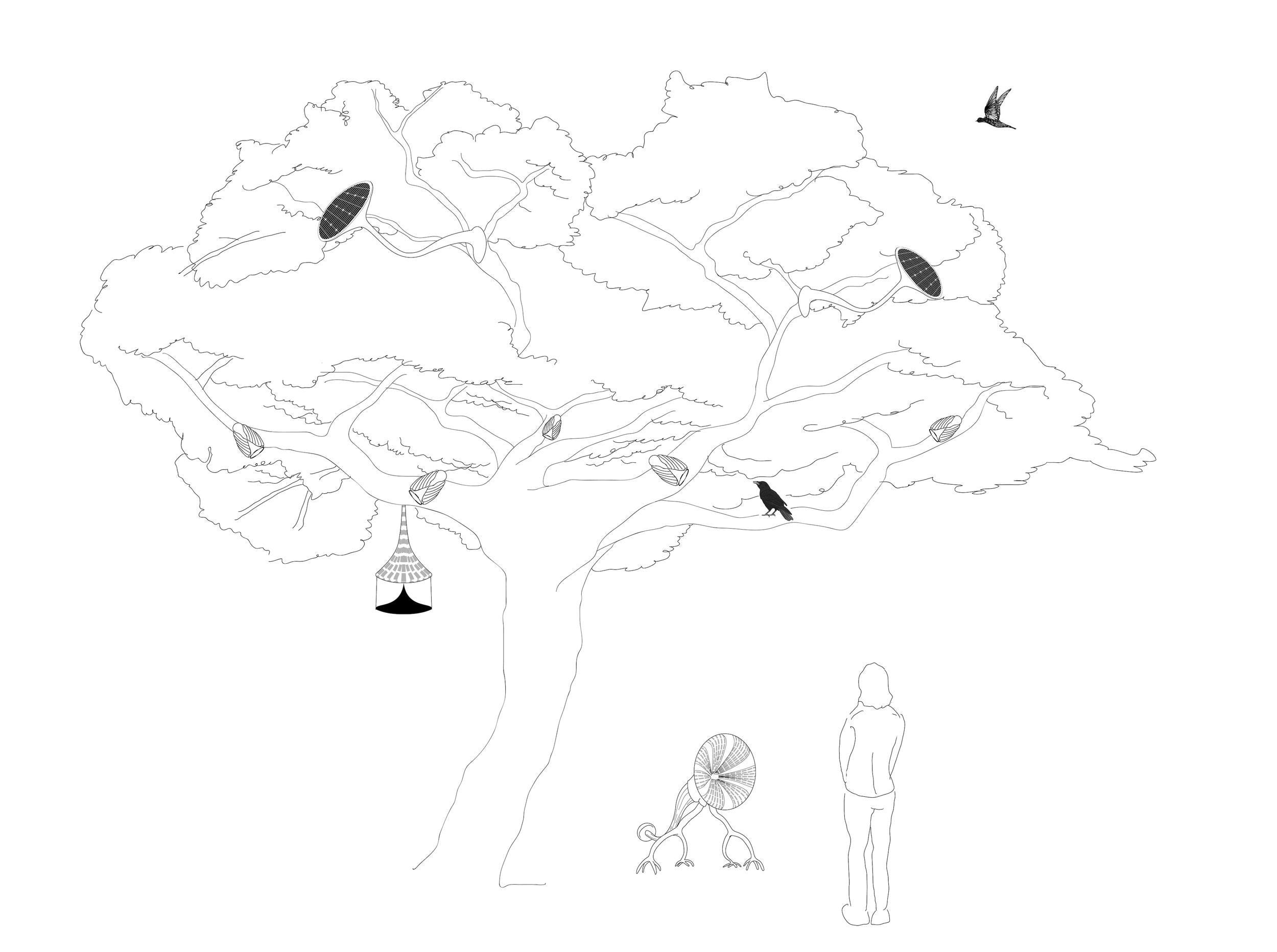 In the park where you’re still seated on your bench, listening, the sun is coming out. You feel it speckle your skin where it shines through the leaves and branches. There’s a word for this in Japanese: Komorebi. It’s also the title of one of Matteo’s previous works with artificial creatures, a swarm of robots responding to cues of sunlight through leaves with sound. Much like language (and communication beyond the human), much like our bodies, or bird bodies, or trees, these machines are Open Wholes. Functioning systems in their own right, but open to the shared world they inhabit and unfold in. New meaning is made from doing something together over and over, forming a habit. Words are habits. Most of our computers are not like that. They are automatic machines: their reactions are determined by a fixed original input of data, rather than continuous cues from the world.